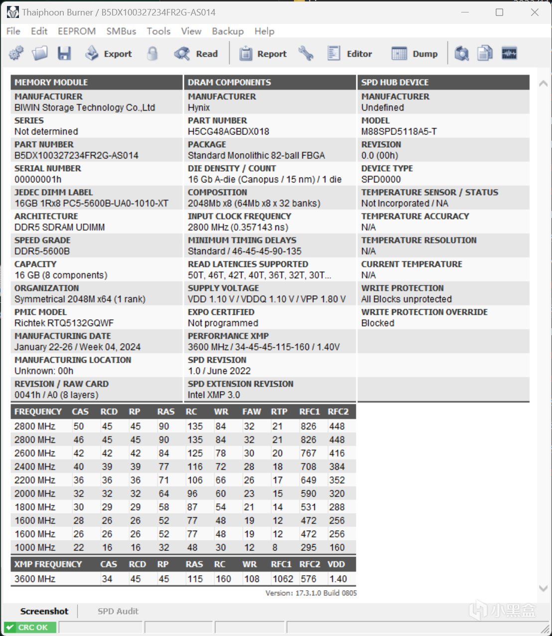 开测之前使用Thaiphoon Burner检测一下内存颗粒,初始内存频率为DDR5-5600MHz,确认为原厂海力士A-Die超频颗粒,理论上会比新M-Die好超一点点。