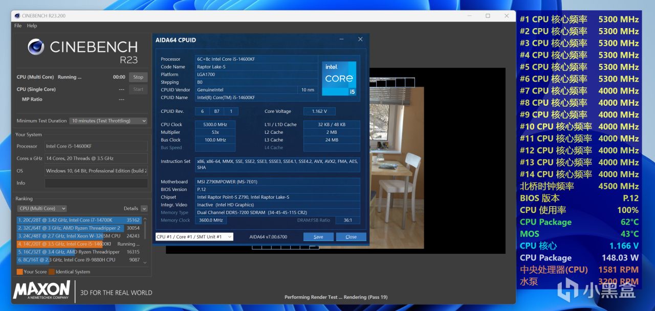 CINEBENCH R23十分钟多核烤机测试,Z790MPOWER+14600KF仅开启XMP情况下,P核心5.3GHz+E核心4.0GHz稳定负载十分钟后,CPU Package温度最高仅62℃,主板MOS温度也只有43℃,CPU核心分配的电压为1.16V,360水冷的水泵和冷排扇也处在非满载状态,这种CPU负载压力其实稍微高端一点的风冷也可压制住,优势是噪声表现会更好。