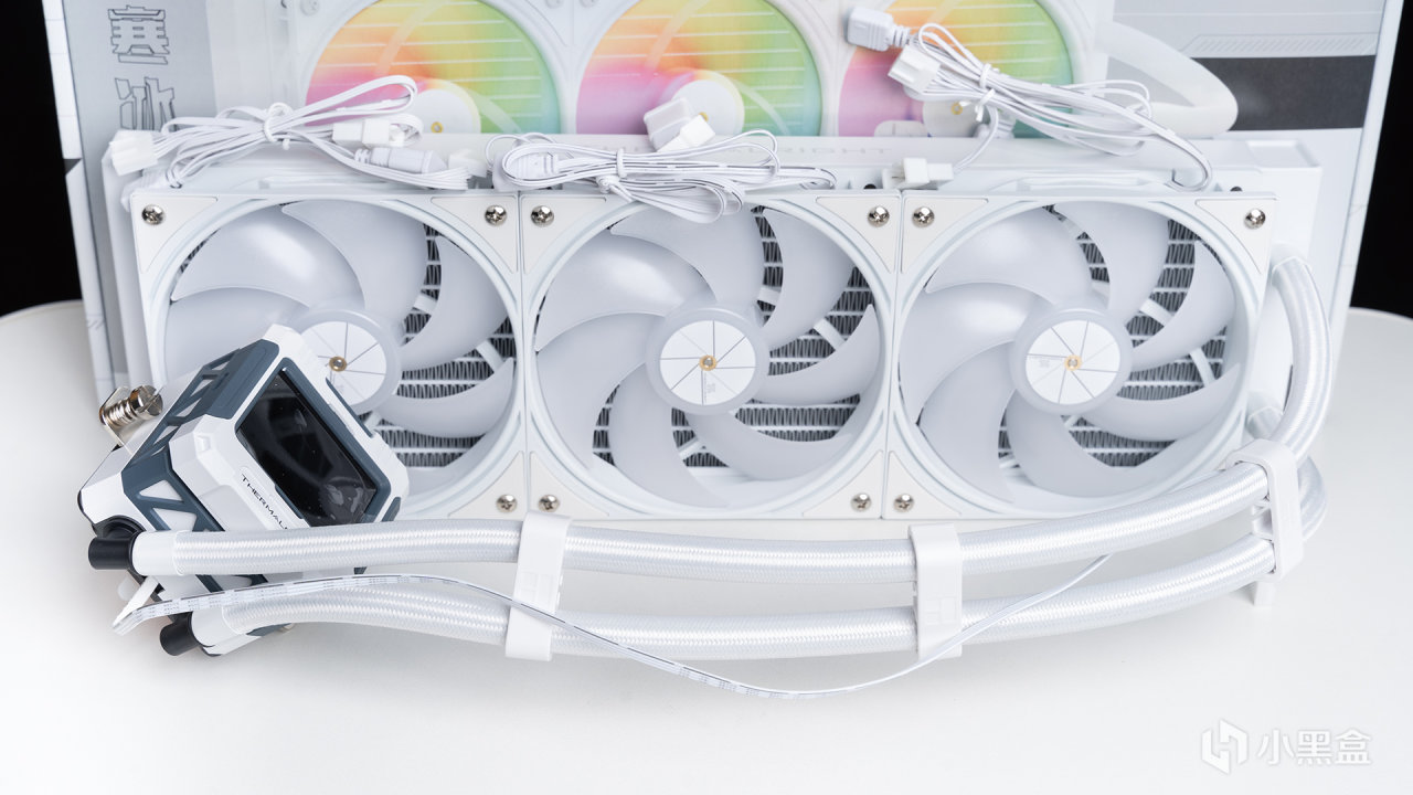 寒冰装甲360水冷出厂状态下已经预装好冷排风扇,风扇是三组TL-P12W-S,配备S-FDB轴承,拥有一公一母头ARGB和供电线材。水管上也预装有三组卡扣,方便装机时更好固定好水管。水冷配套SS2金属扣具体系,这套扣具是利民全系散热器通用的,而且贴合精度也很高。