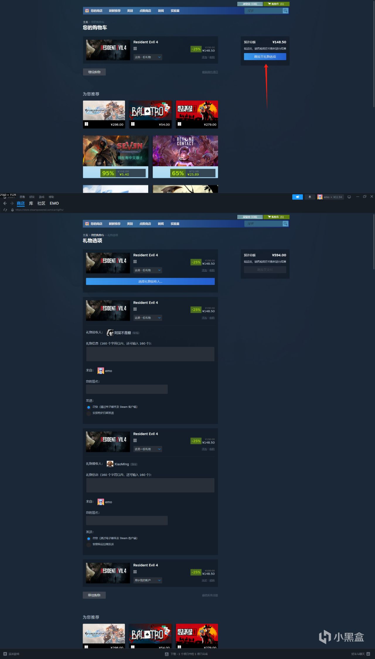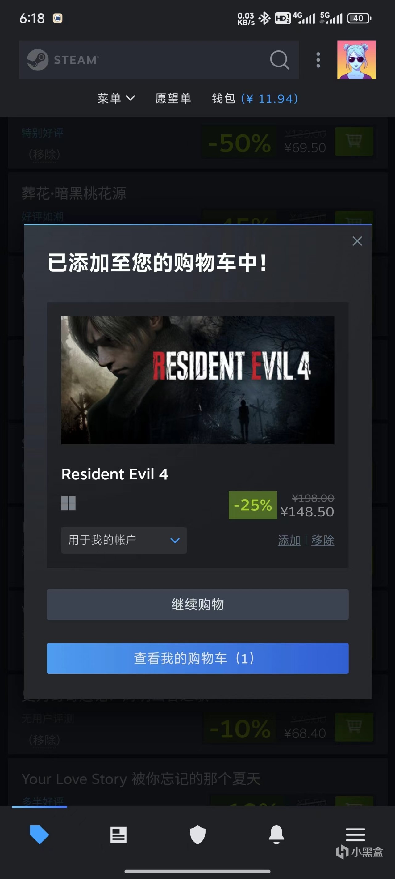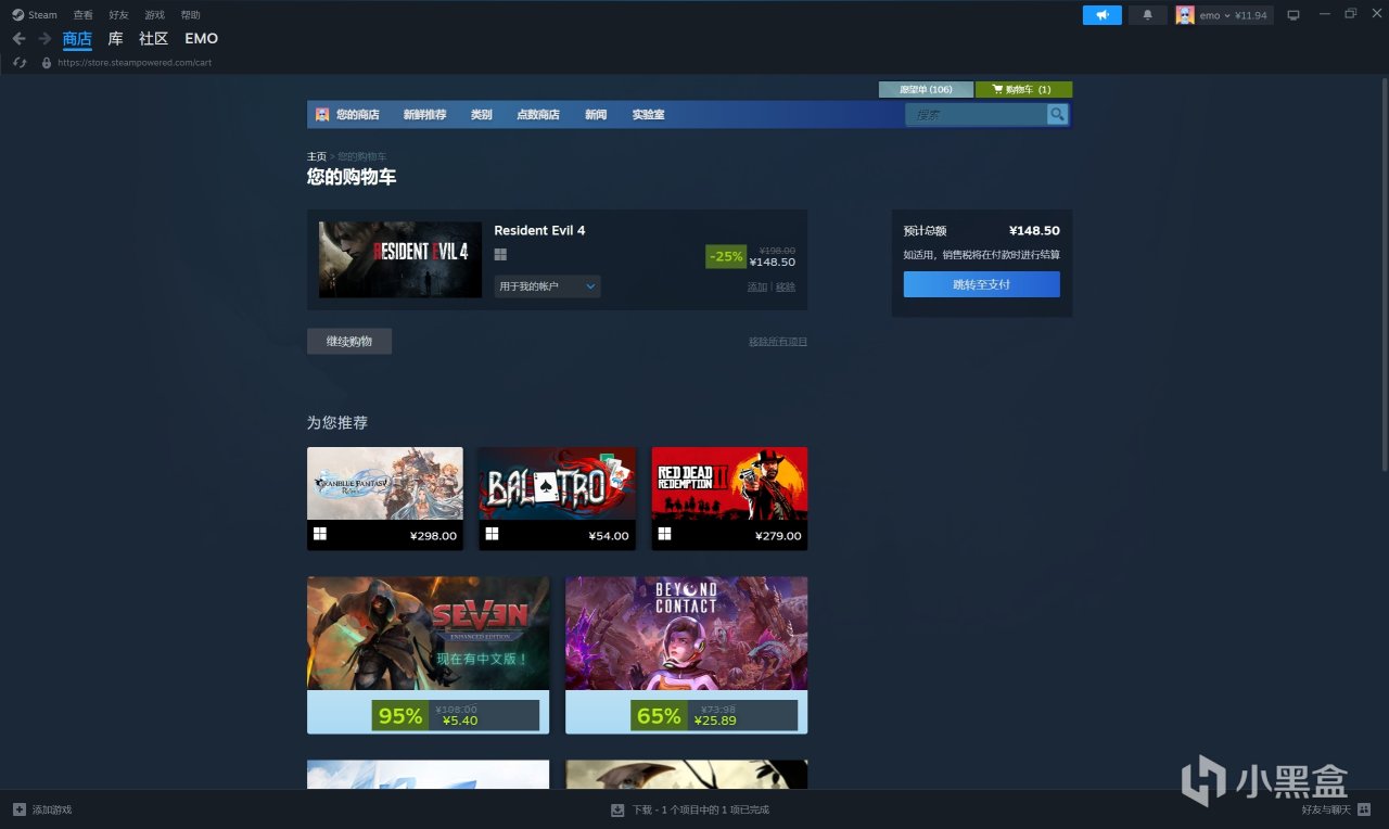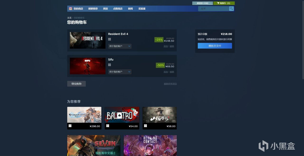 购物车清空后在手机上添加了《生化危机4:重置版》,然后刷新客户端和网页端的购物车界面就会同步: