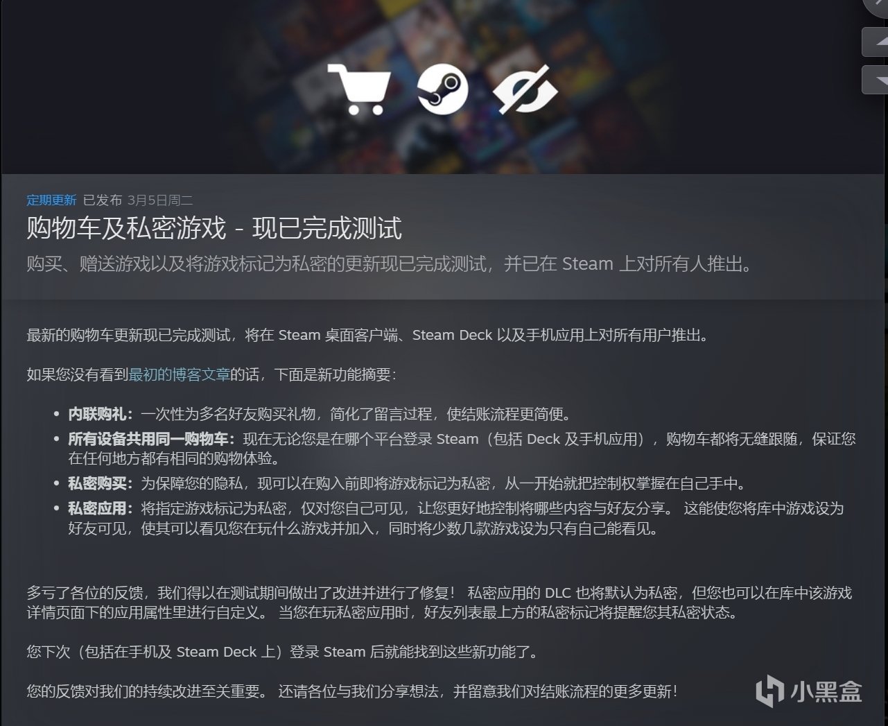 最后放一个steam更新公告链接:购物车及私密游戏 - 现已完成测试
