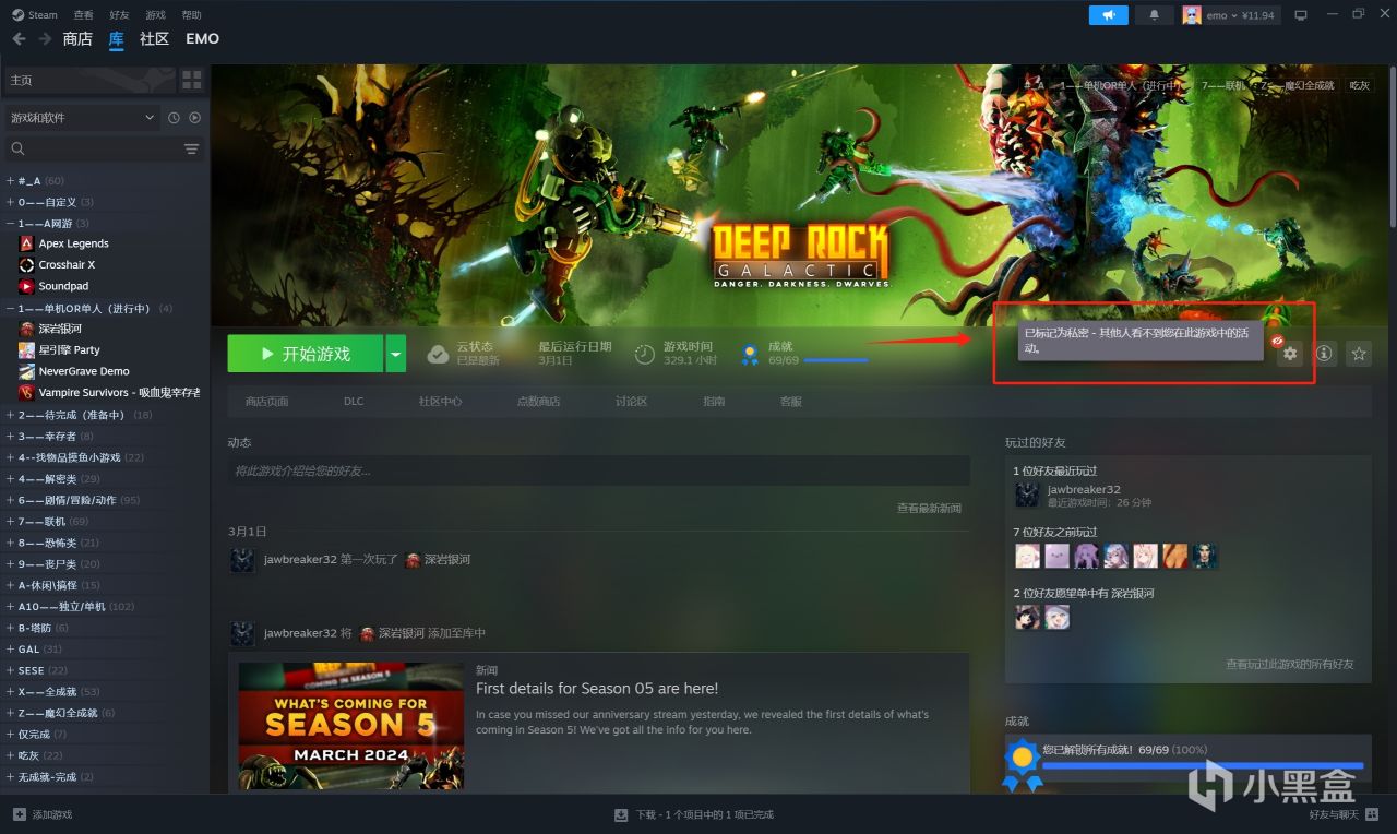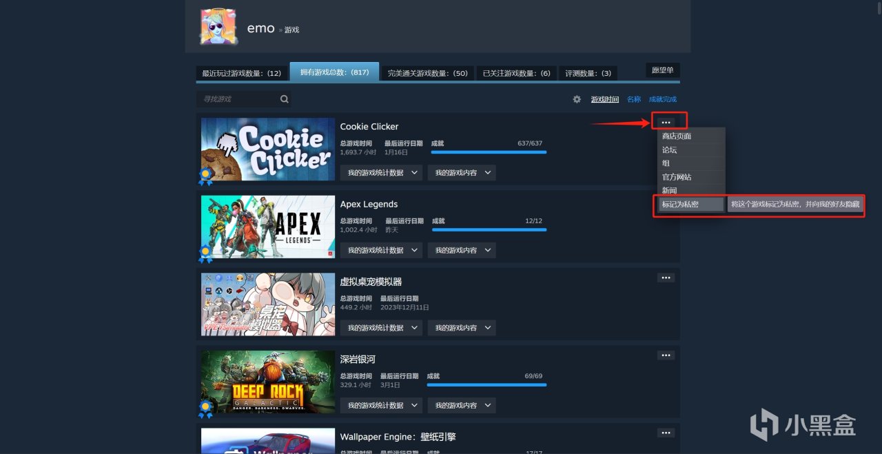 - 将游戏标记为私密会使其在库之外的所有地方隐藏。其他人不会看到您拥有该游戏、在玩该游戏,也不会看到您在该游戏中的游戏时间以及动态