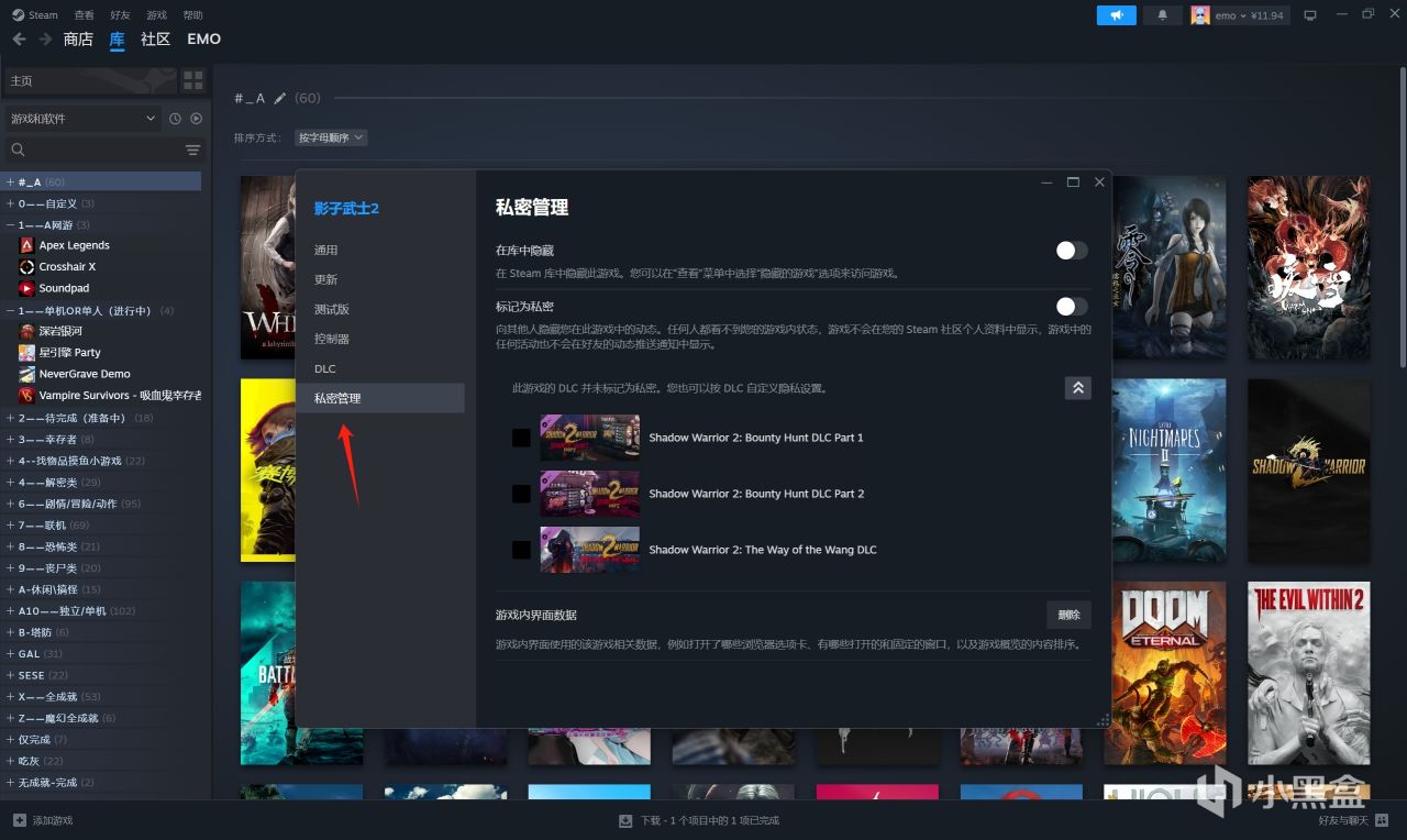 - 如果该私密游戏有DLC,默认直接一起私密,若你想更细致的设置,则在该游戏属性里面具体设置