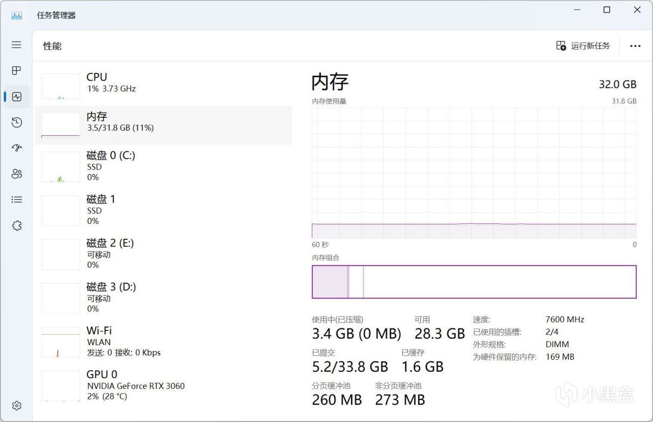 进系统后,可以在任务管理器中找到【内存】就能够看到,内存的运行速度:7600 MHz。