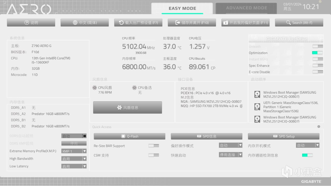 开机进入BIOS界面后,开启XMP,重启电脑就能生效了。再次进入BIOS界面可以看到内存频率:6800 MT/s。为了将内存性能发挥更极致,默认是停用了【DDR5自动超频】,在【Extreme Memory Profile(X.M.P)】中启用【XMP1】,记得将【High Bandwidth】、【Low Latency】都启用,就可以享用技嘉内存低延迟高带宽的黑科技啦。