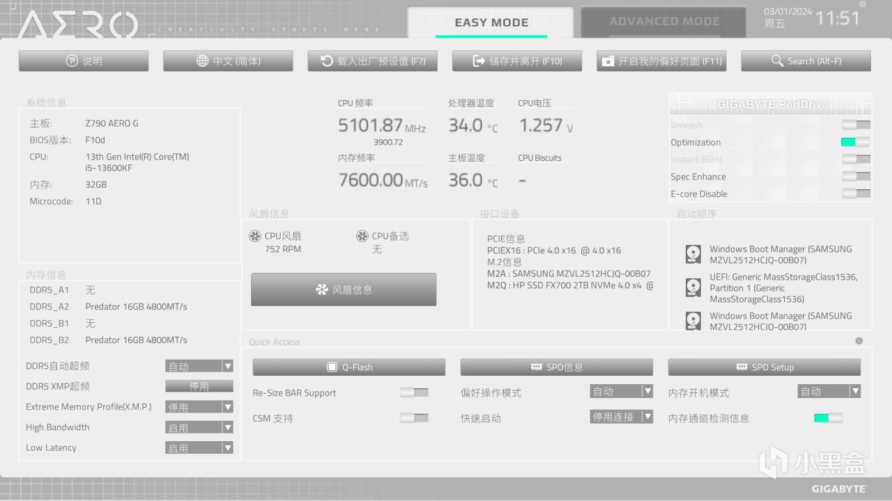 开机进入BIOS界面后,开启XMP,重启电脑就能生效了。再次进入BIOS界面可以看到内存频率:7600 MT/s。为了将内存性能发挥更极致,默认是启用了【DDR5自动超频】,停用了【DDR5 XMP超频】,停用了【Extreme Memory Profile(X.M.P)】,但是一定要记得将【High Bandwidth】、【Low Latency】都启用,就可以享用技嘉内存低延迟高带宽的黑科技啦。