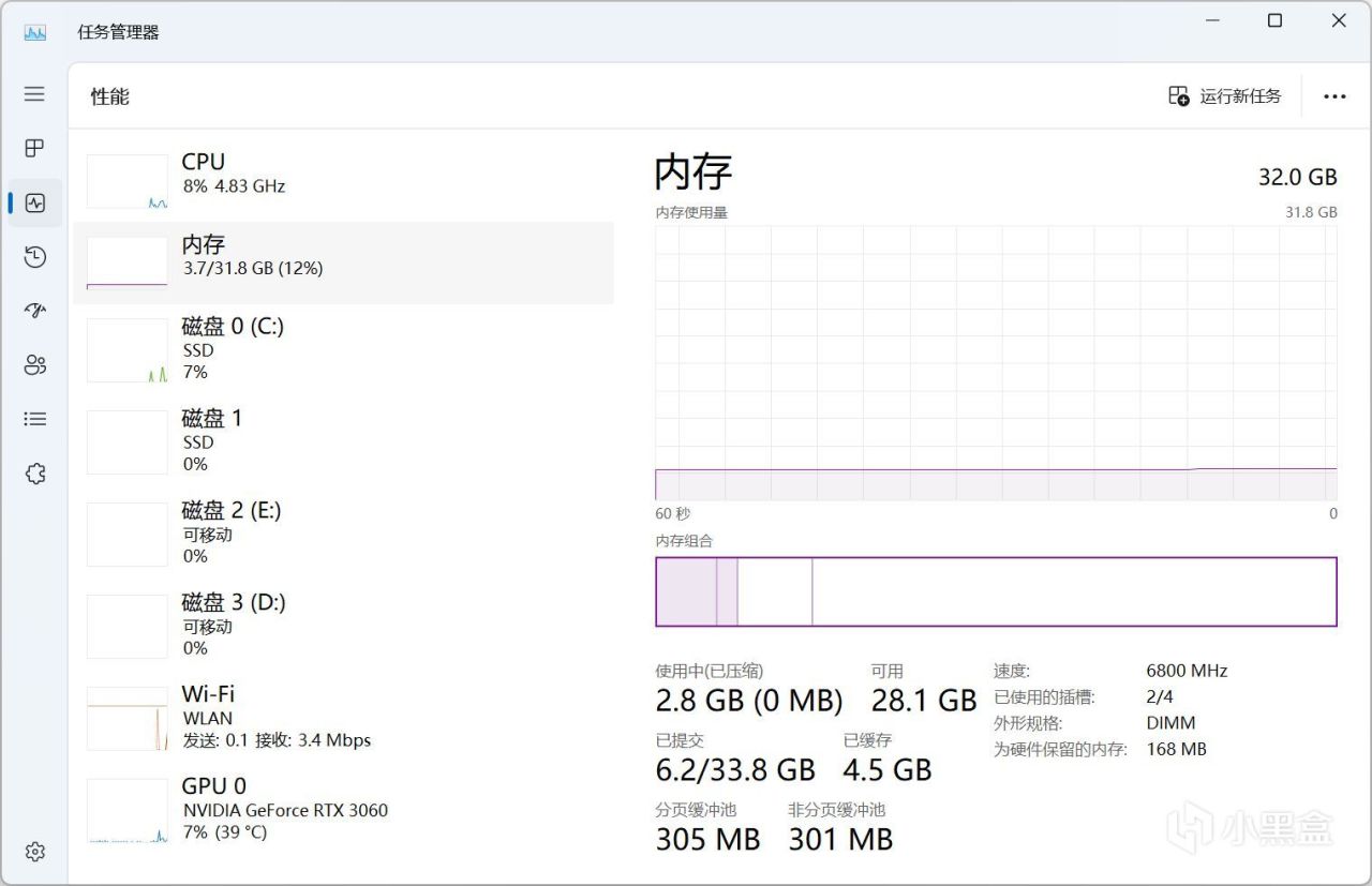 进系统后,可以在任务管理器中找到【内存】就能够看到,内存的运行速度:6800 MHz。