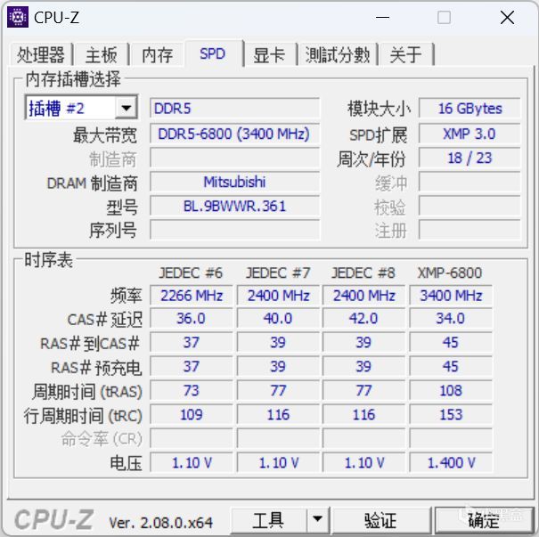 通过CPU-Z软件可以看到宏碁掠夺者的炫光星舰(Vesta)II 灯条的XMP可以达到6800MHz(频率等效3400MHz),在1.40V电压下时序为:CL34。