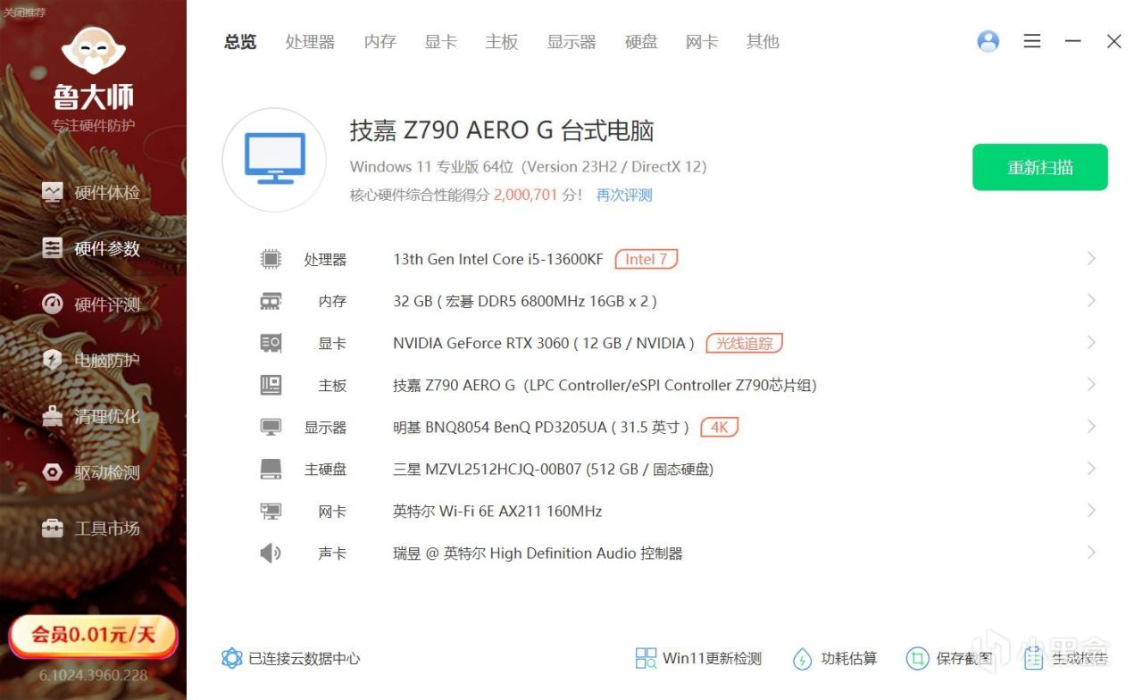 本次测试的平台是13代酷睿i5-13600KF、技嘉Z790主板。硬件配置属于目前的主流搭配,尽管不是目前14代酷睿级别的处理器,但是受众群体会更广泛,那就看看鲁大师软件的跑分吧。