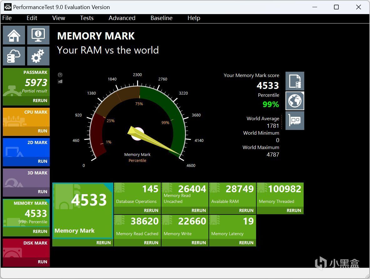 用Performance Test 9.0软件进行【MEMORY MARK】,跑分:4533,位列全球排行榜前99%的位置。这个就是宏碁掠夺者的炫光星舰(Vesta)II 灯条所采用的特挑海力士A-die内存颗粒和不锁SA电压下强劲的性能表现。