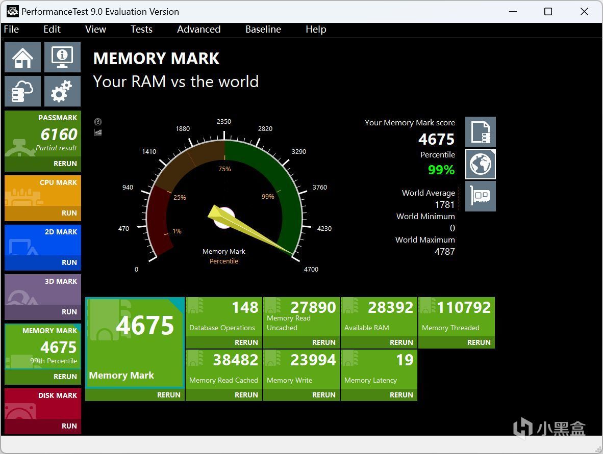 用Performance Test 9.0软件进行【MEMORY MARK】,跑分:4675,位列全球排行榜前99%的位置。说明了宏碁掠夺者的炫光星舰(Vesta)II 灯条特挑的海力士A-die内存颗粒在不锁SA电压的情况下,仅手动对内存进行超频后就能达到7600MHz的高频体验。