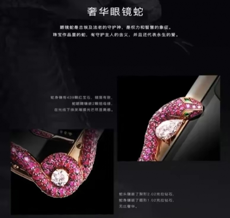 但奢华的不是配置,而是用料和高端私人订制服务,蓝宝石屏幕,蛇身镶有439颗红宝石,错落有致,蛇眼牌镶嵌2顺祖母绿,在光线下焕发璀灿光芒尽显美感。