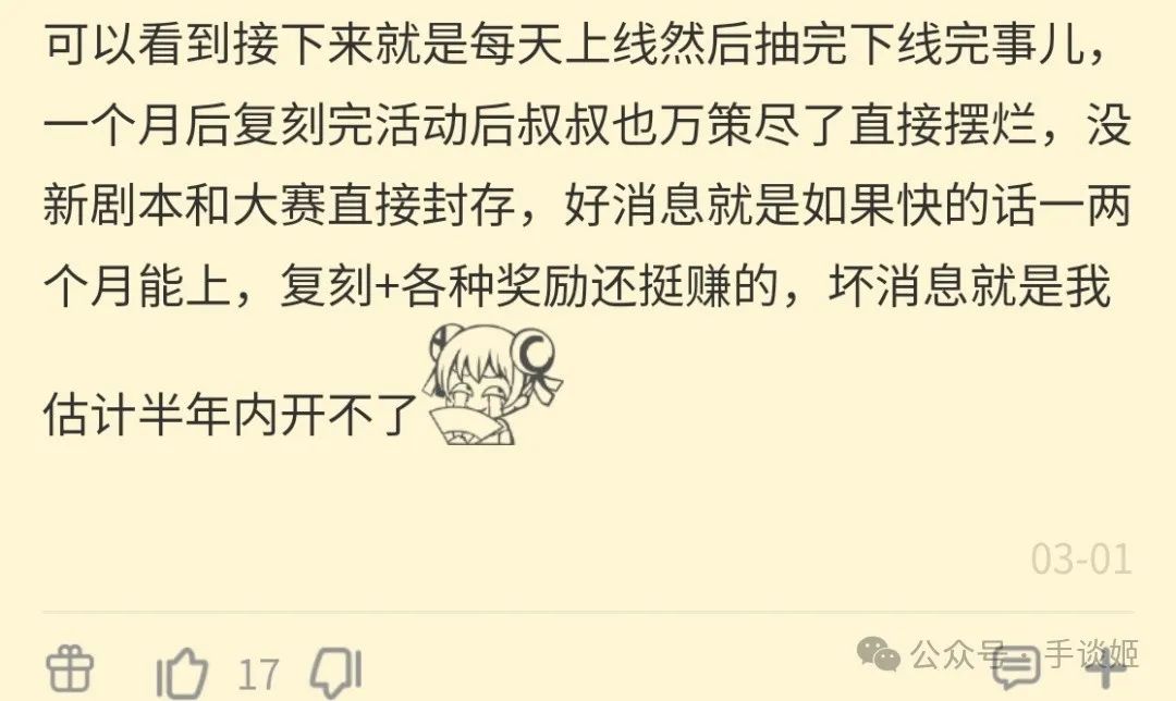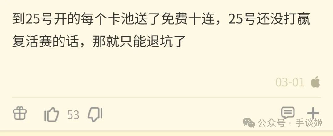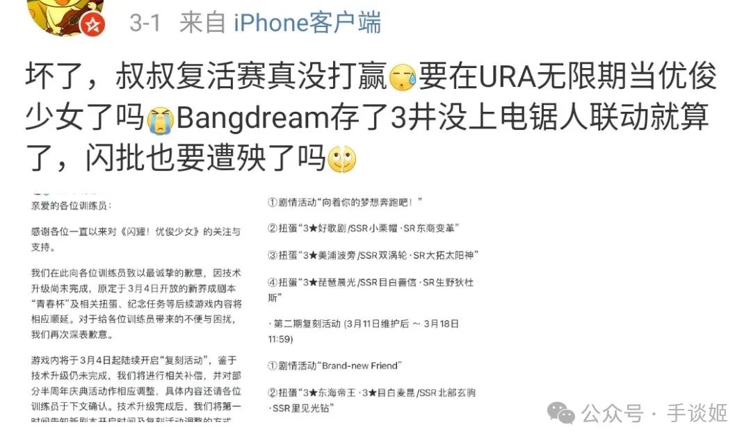 現如今,貼吧微博論壇B站等地方的玩家都在觀望,希望叔叔的馬能打贏復活賽,要是這輪復刻結束,青春杯還無法更新的話,估計大量玩家會離開。