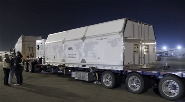 这台型号为Twinscan EXE:5000的光刻机着实是个庞然大物,运输过程中动用了250个货箱,总重约150吨,先用飞机从荷兰运到俄勒冈州波特兰,再用卡车分批次拉到工厂。