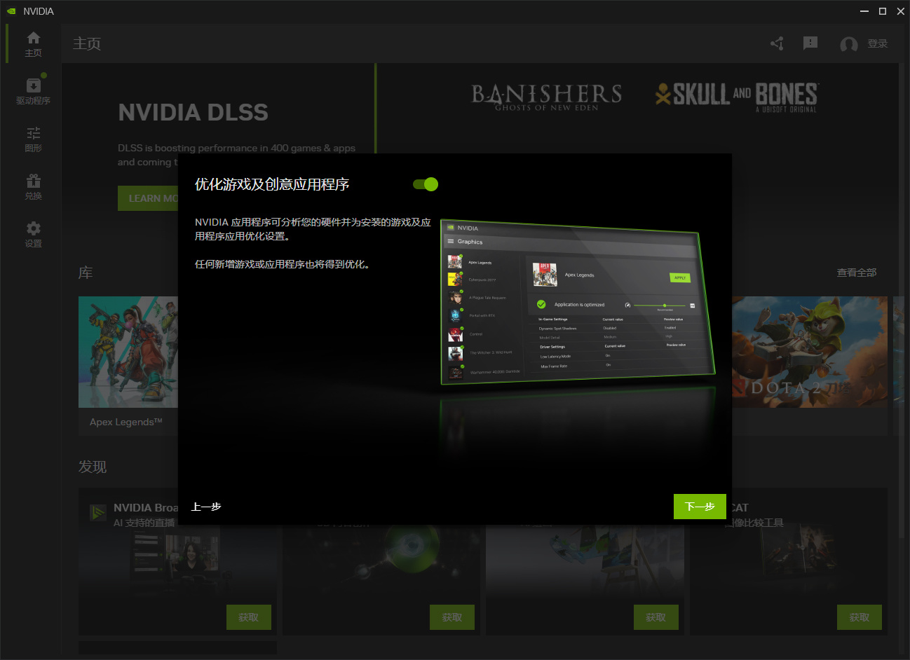首先是主页模块,我们可以看到整个界面非常的简约直观。顶部是资讯轮播banner,可以获取一些驱动、游戏相关的最新资讯;中间是本机的<库>,可以在此启动游戏及应用;最下面的<发现>则集合了NVIDIA Broadcast、Omniverse、Canvas等多种应用,用户可以轻松从这里获取下载及进入程序。