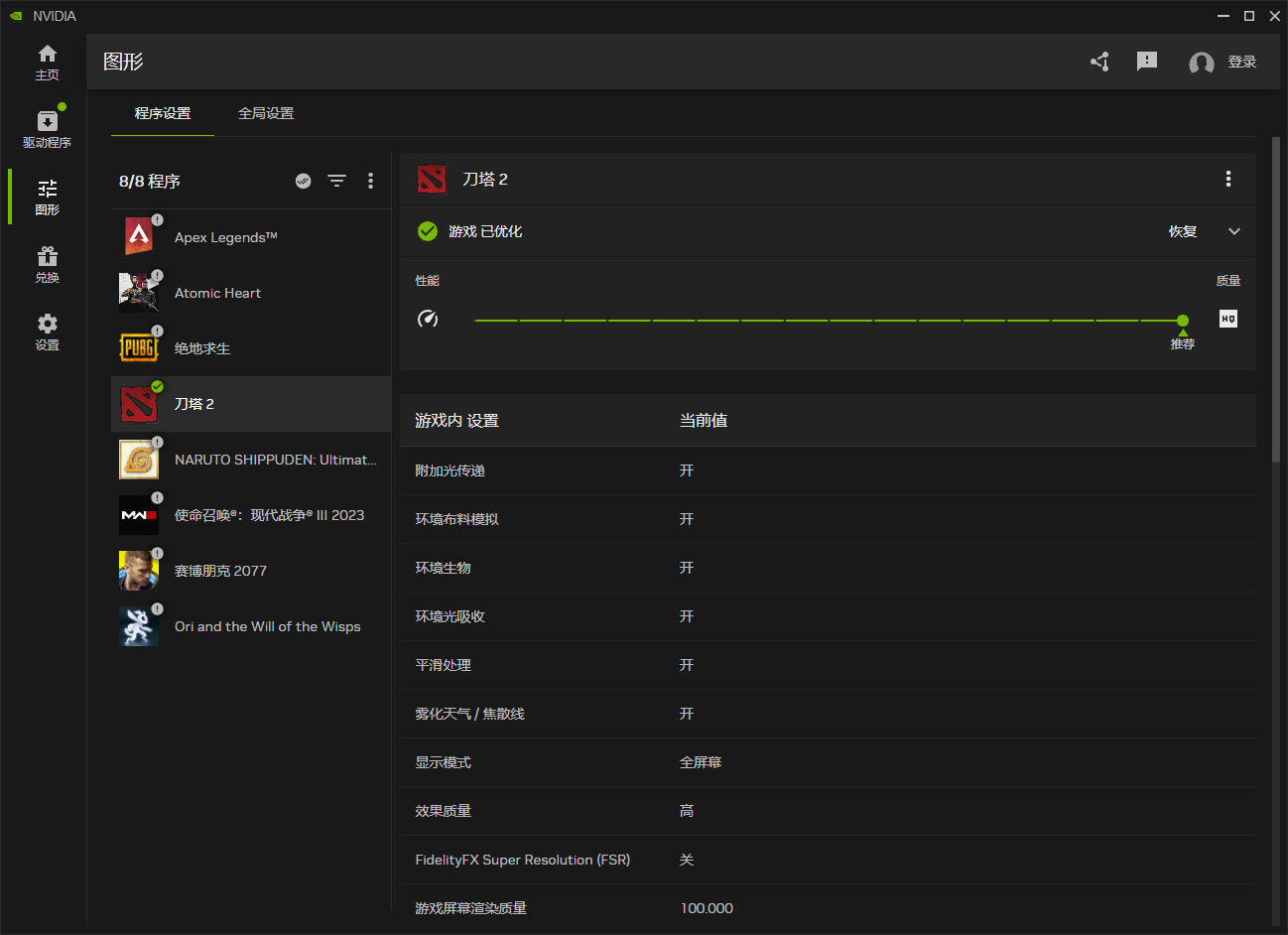 紧接着的图形模块,是这款软件的重中之重。用户可以针对游戏分辨率、质量、画面效果等进行设置,并直接在游戏中应用。新增的RTX 数字亮丽、RTX HDR这俩重磅功能也集成在了这里。