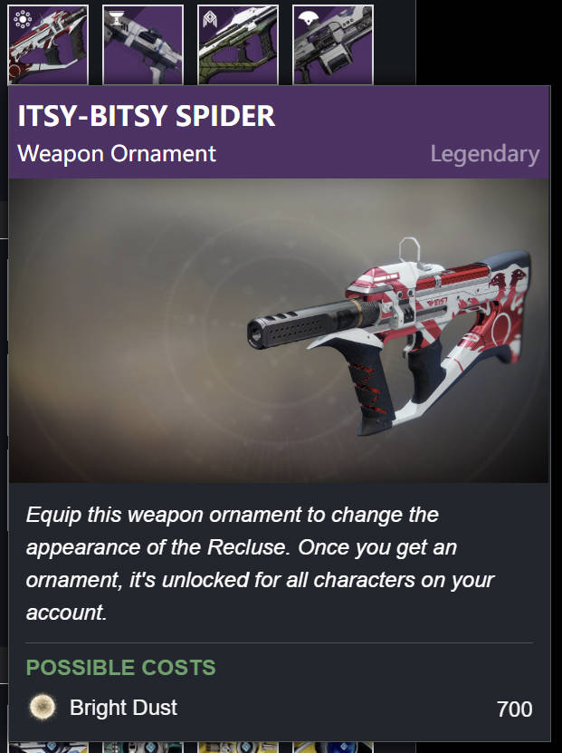 • 值得注意的是武器部分:其中有黑色軍武錘頭和舊巔峯武器隱士的皮膚。按照目前的更新日程來說,接下來的大更新就是4月的準備進入光能,這是否意味着這2把武器將會在屆時迴歸(具體信息以日後BUNGIE週五的週報和遊戲實際內容爲準)