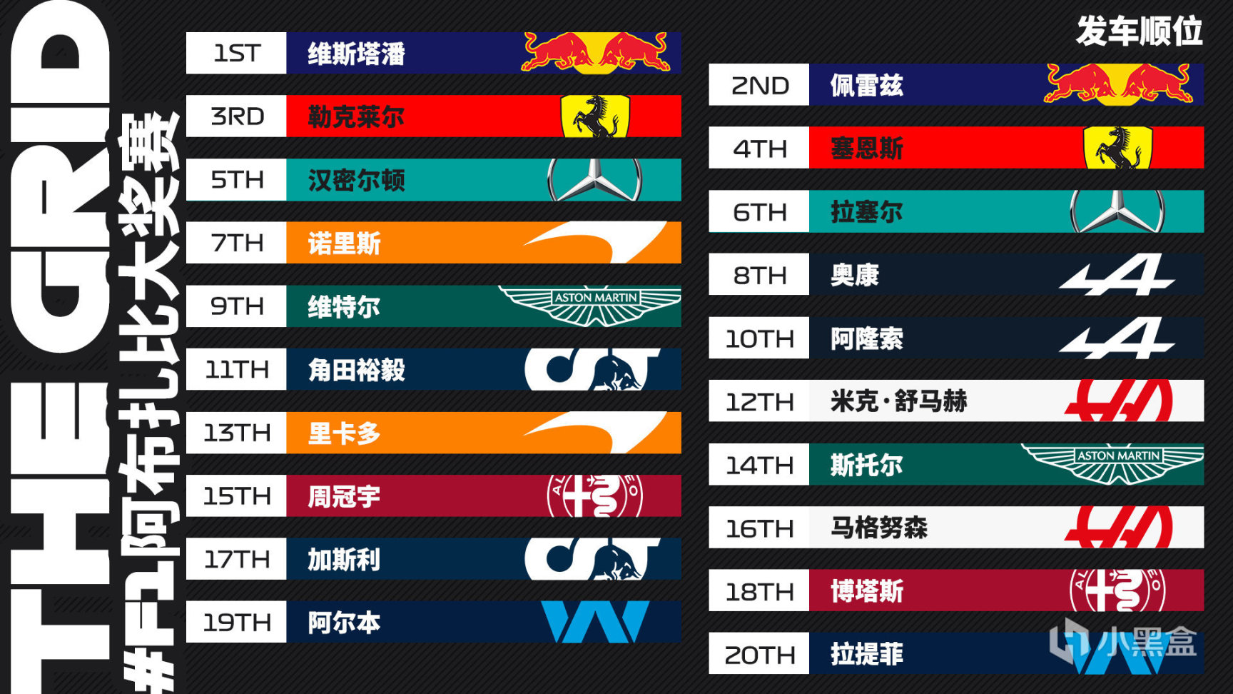 因爲維斯塔潘提前鎖定年度車手總冠軍,本站在於年度亞軍的爭奪,法拉利車隊的勒克萊爾與佩雷茲同分來到阿布扎比,上一站,維斯塔潘拒絕將第六讓給自己的隊友,讓佩雷茲無法以領先的情況進入賽季收官戰!11月18日,週五的練習賽中,漢密爾頓和維斯塔潘分別獲得一二練頭名!