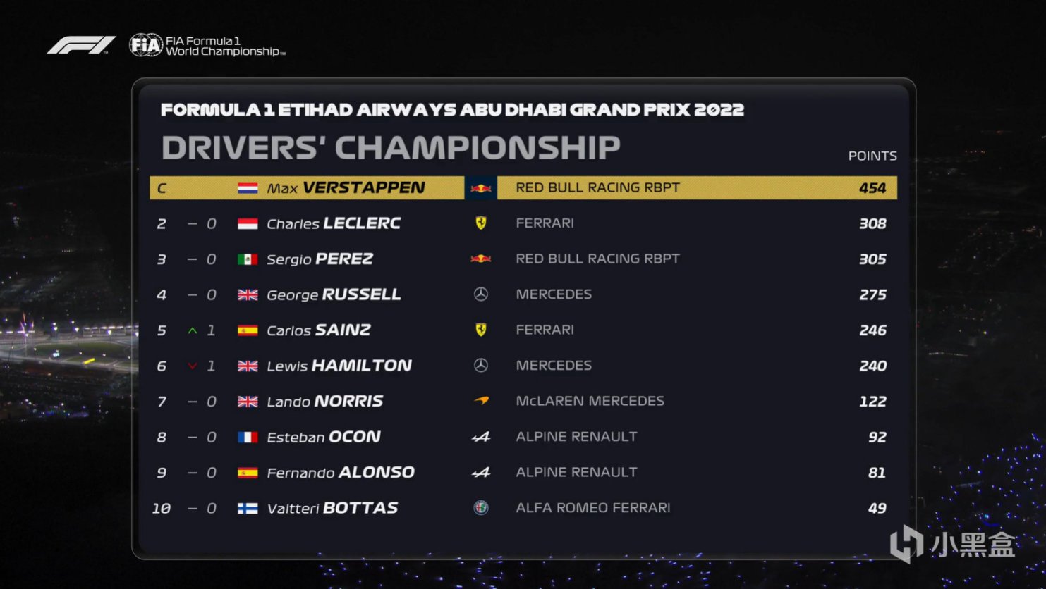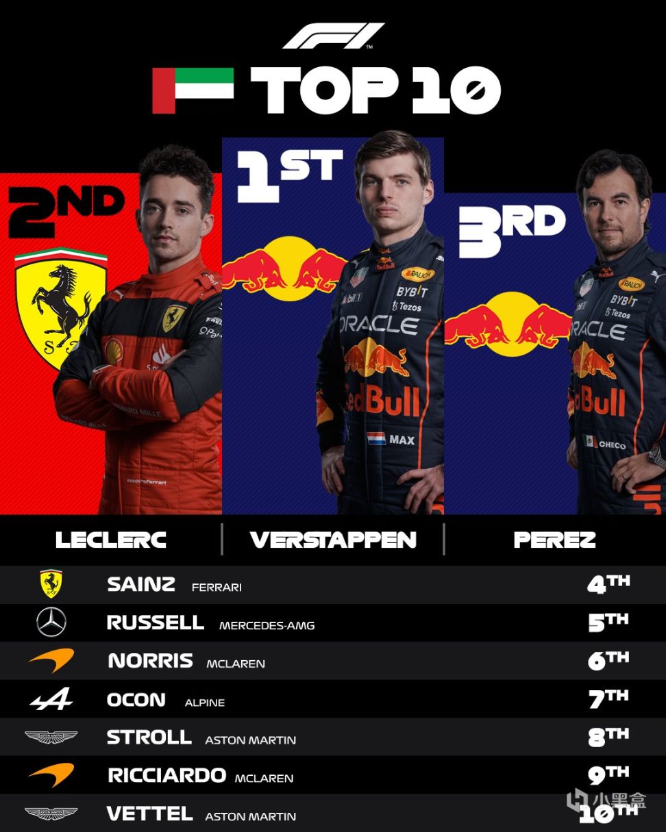 2022年11月20日,F1大獎賽來到阿布扎比大獎賽!維斯塔潘奪得冠軍,衛冕本賽季的年度車手冠軍!而漢密爾頓擋住佩雷茲,變相幫助勒克萊爾奪得本站亞軍,並拿下年度車手亞軍!四屆F1世界冠軍維特爾正式退役,這位老將職業生涯一共登上122次領獎臺,獲得過53次分站冠軍,正如世界盃是許多球星的最後一舞,青春哪有不散的筵席,本站也是F1收官戰,下賽季再見!