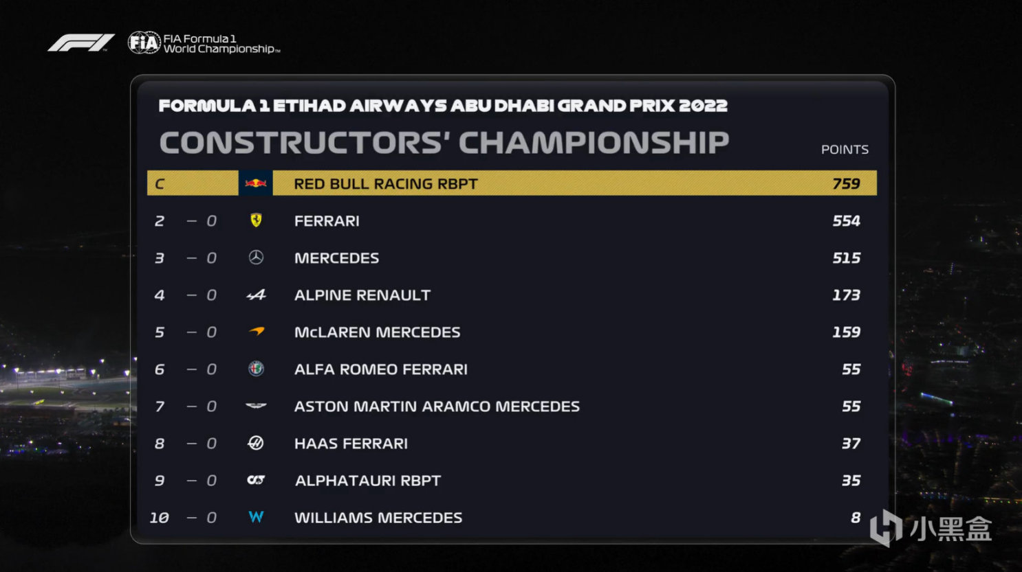 車手積分上,本站勒克萊爾使用一停的對抗策略,對陣佩雷茲的兩停策略,本站維斯塔潘雖然奪得車手總冠軍,然而卻並沒有幫到隊友佩雷茲什麼,反而是漢密爾頓幫勒克萊爾攔住了佩大師,去年阿布扎比的戲碼再次上演,反觀維斯塔潘一邊享受到去年佩大師防守的紅利,一邊又有PUA佩大師的嫌疑!不過總而言之,還是恭喜維斯塔潘成功衛冕車手總冠軍,在個人生涯上再進一步!