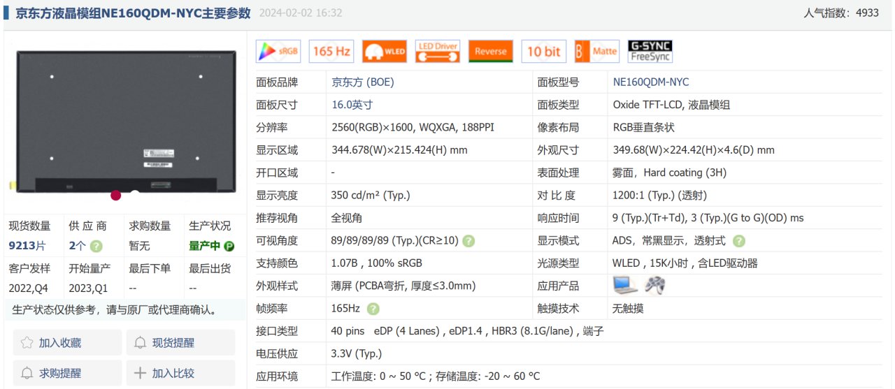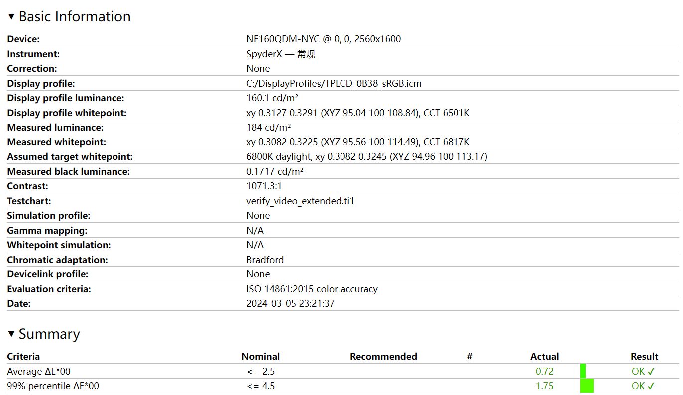 最後來看一下屏幕測試,Y7000P 2024這次依舊配備了一塊1600P的165Hz高刷屏,面板來自京東方,型號爲:NE160QDM-NYC。原生面板信息如下: