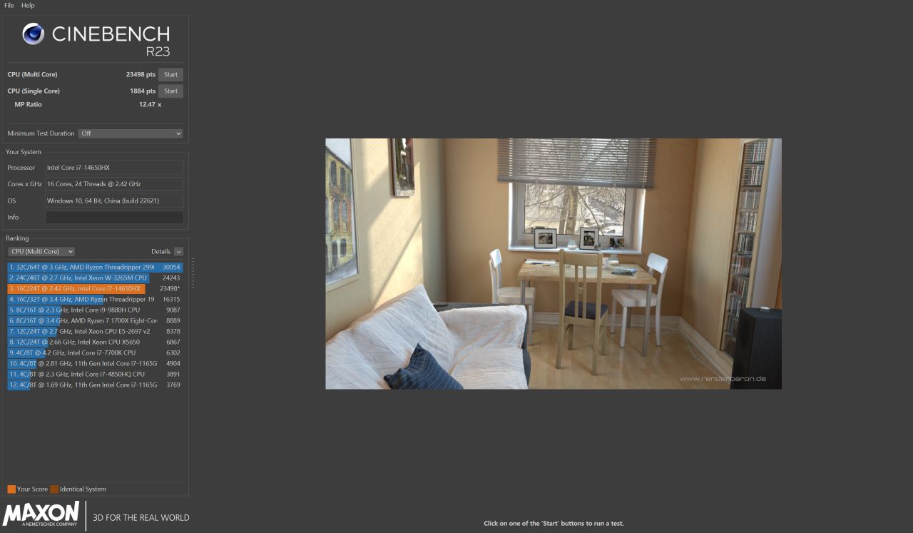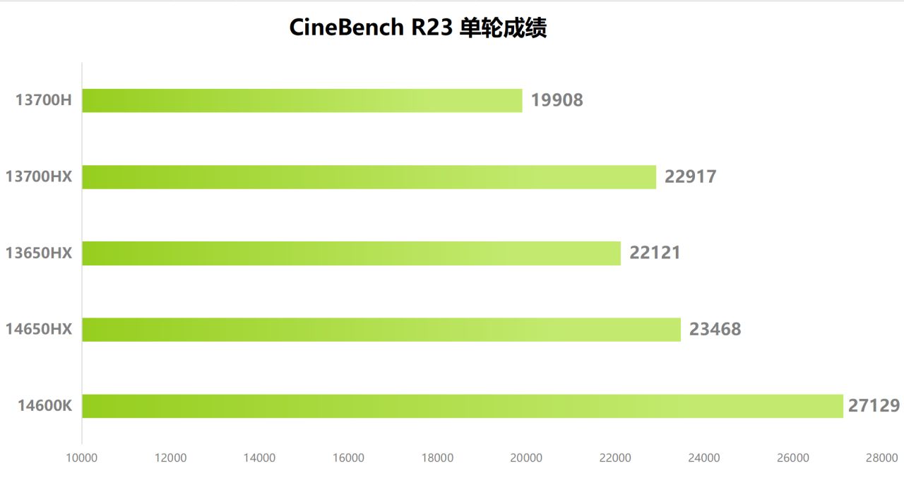 首先來看理論性能測試部分,Y7000P上這顆14650HX在R23單輪多核跑分23498,單核得分1884。相較上一代13650HX多核得分提升6%,同樣小幅領先上代的13700HX。