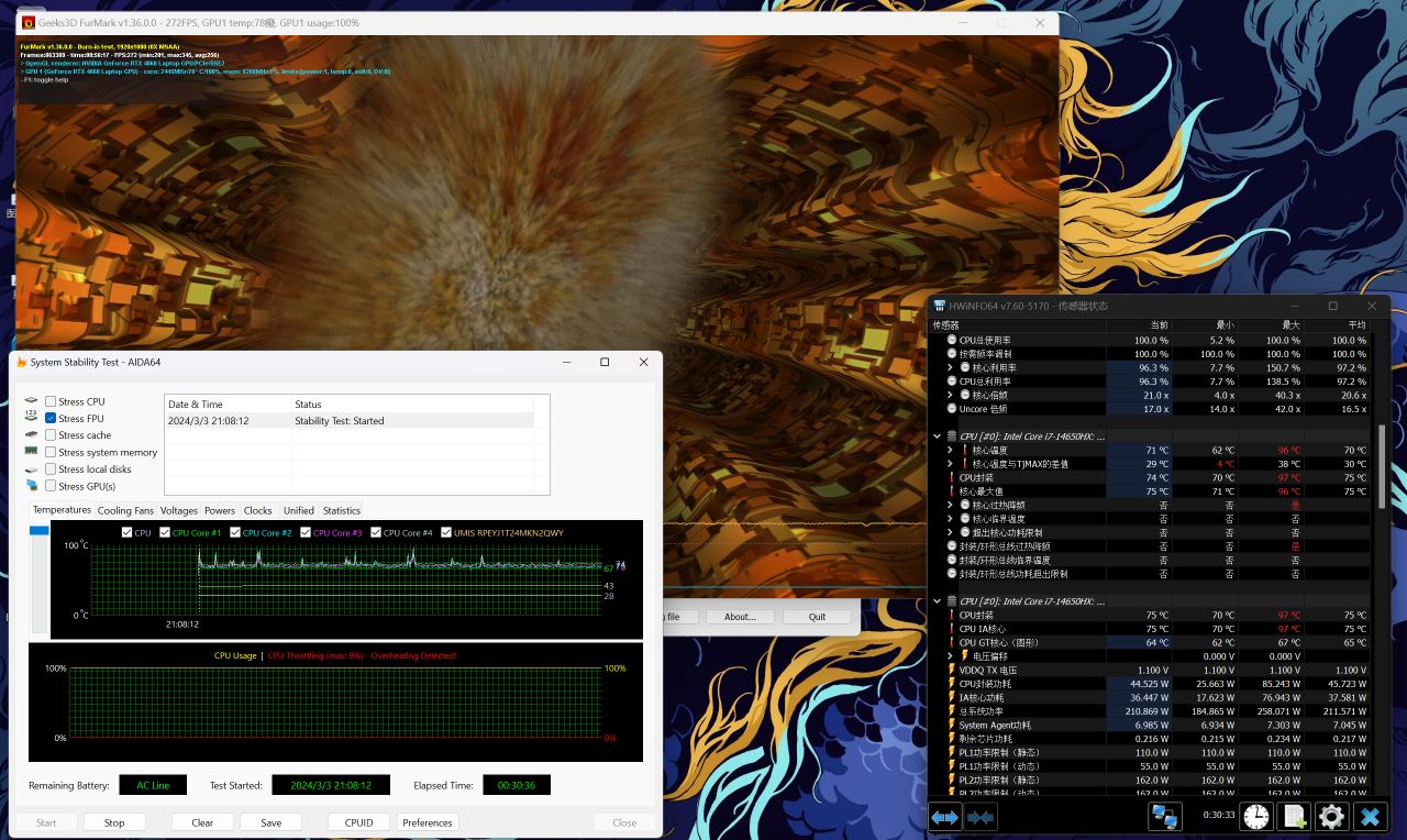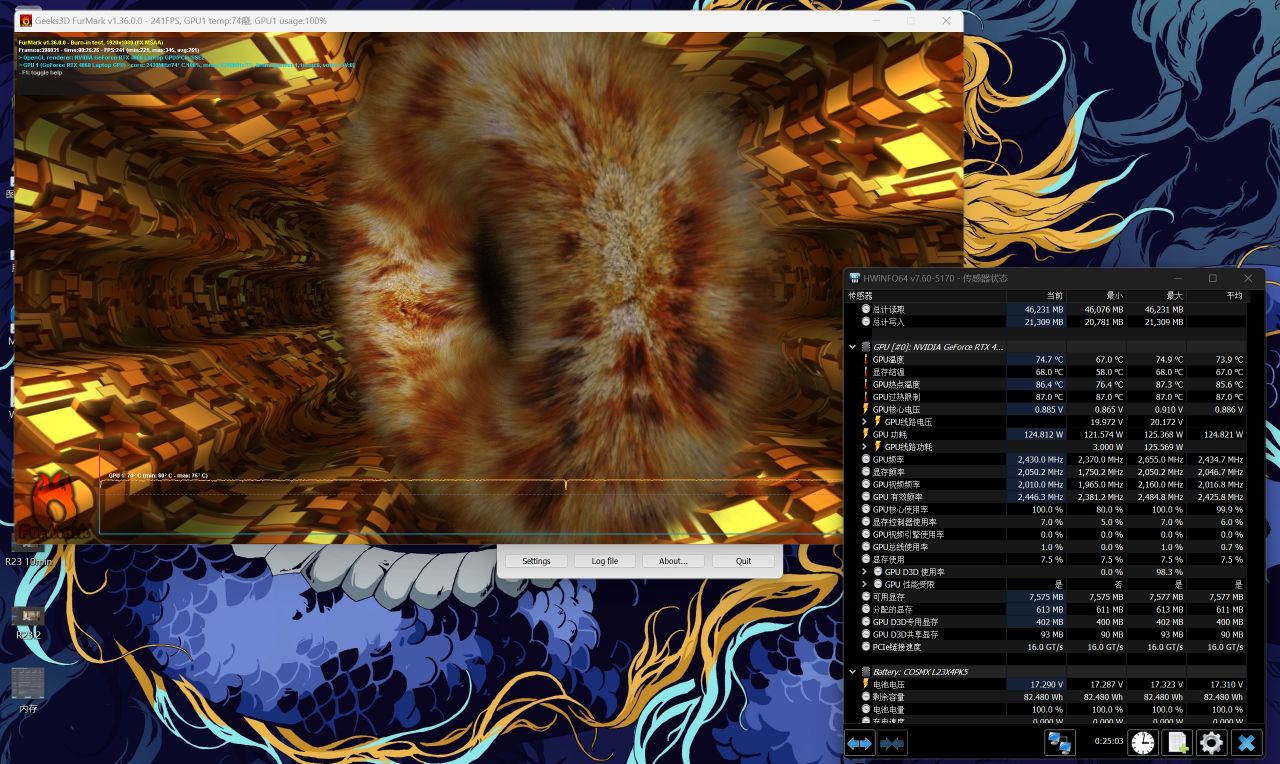 最後是壓力更大的雙烤測試,在持續30分鐘後,CPU功耗下降到45W,溫度74°。P核頻率2.49Ghz,E核頻率1.89Ghz。顯卡功耗則繼續穩定在125W,頻率2400Mhz,溫度繼續維持在78°附近。
