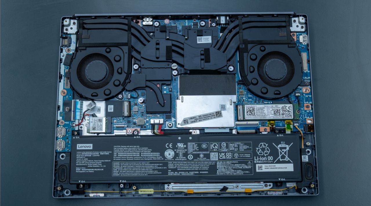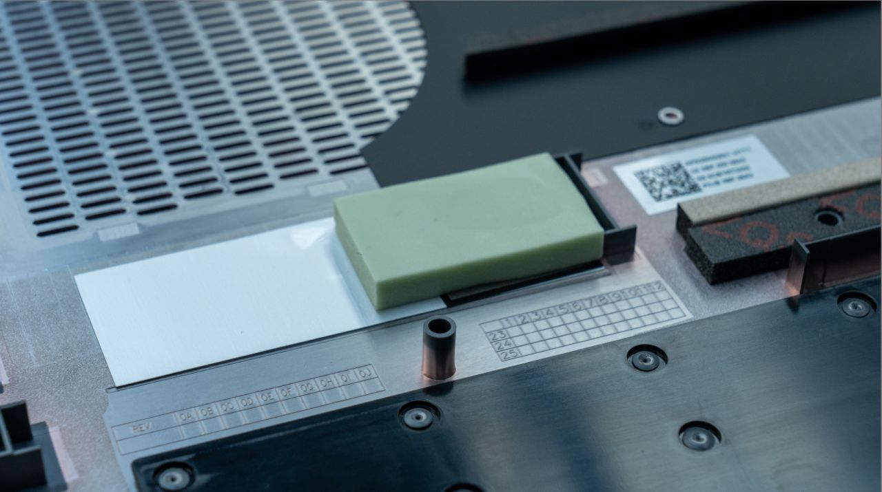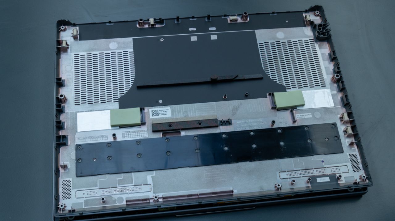 通過對拆解圖的觀察,我們可以發現這次的Y7000P不僅調整了風扇的方向,而且在底殼部分增加了擋風泡棉。這樣的設計在筆記本內部形成了一道屏障,使散熱系統的冷氣只能向上排出帶走筆電內部的熱量。不僅提升了風扇的運行效率,而且也更好的輔助構建了機器內部的散熱風道。