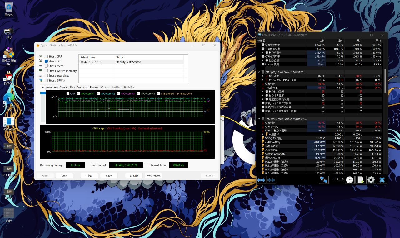 散熱性能實測環節,使用FPU進行30分鐘的CPU烤機壓力測試。在烤機過程中CPU的功耗維持在100W左右,核心溫度穩定在82°,封裝溫度則爲97°。值得關注的是,P核頻率維持在3.59GHz,而E核頻率爲2.89GHz,人位噪音爲54分貝。