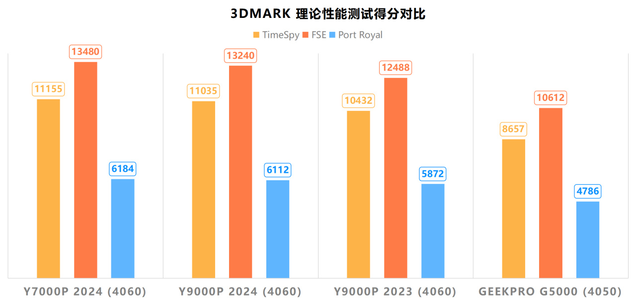 在實際的跑分對比中, 今年的Y7000P 2024得益於新模具和全新的散熱系統,在理論性能上的得分甚至反超了自家萬元旗艦Y9000P,在三個測試項目衆均有小幅度的領先。