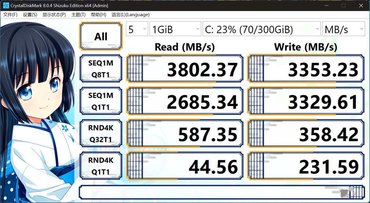 主硬盤採用一塊1TB容量的建興的AM6A1,慧榮主控,國產長江存儲TLC顆粒,實測性能表現如圖。