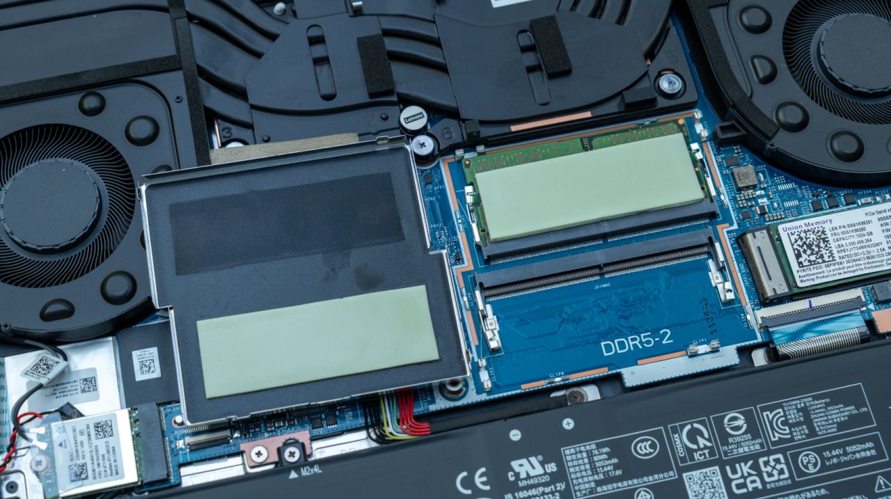正中央屏蔽罩下方是板載內存插槽,自帶一條單面顆粒的鎂光原廠內存,5600Mhz頻率。原廠已經貼好了導熱膠墊。而且另一個空餘內存槽位的散熱貼也已經準備好了, 後續如果有內存升級的需求,直接插上即可。