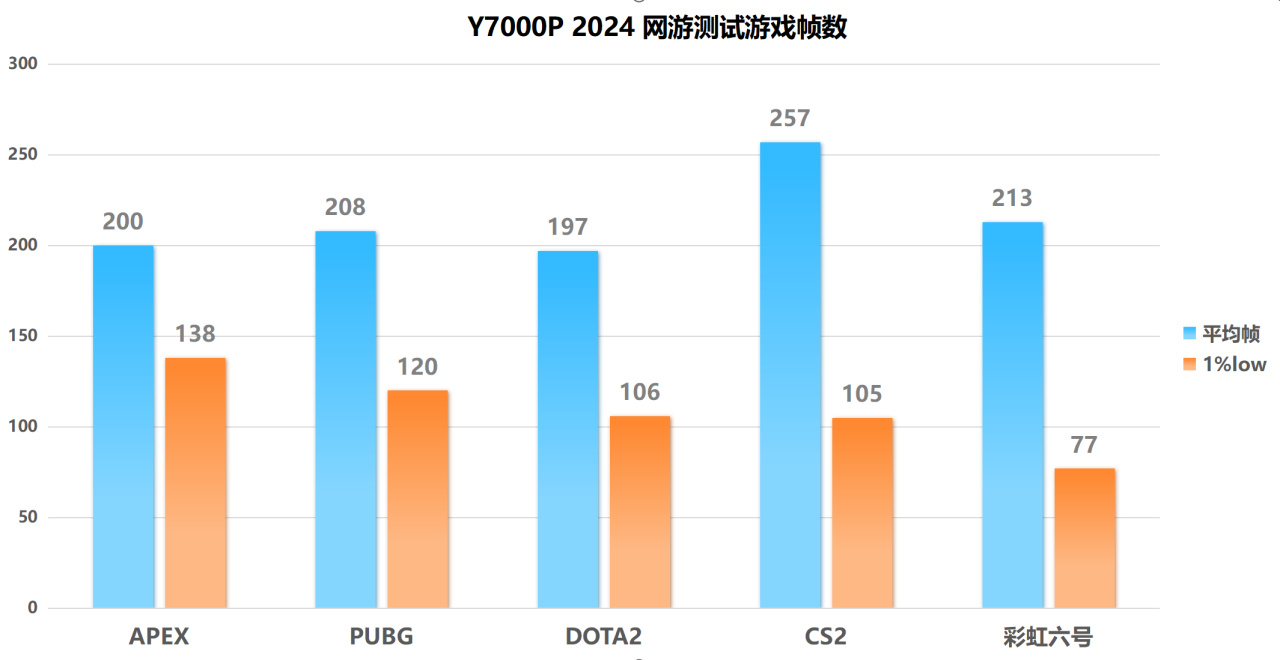 不過就算不看1%Low幀,Y7000P上的這塊RTX4060也能將市面上大部分的網遊推到200幀左右。