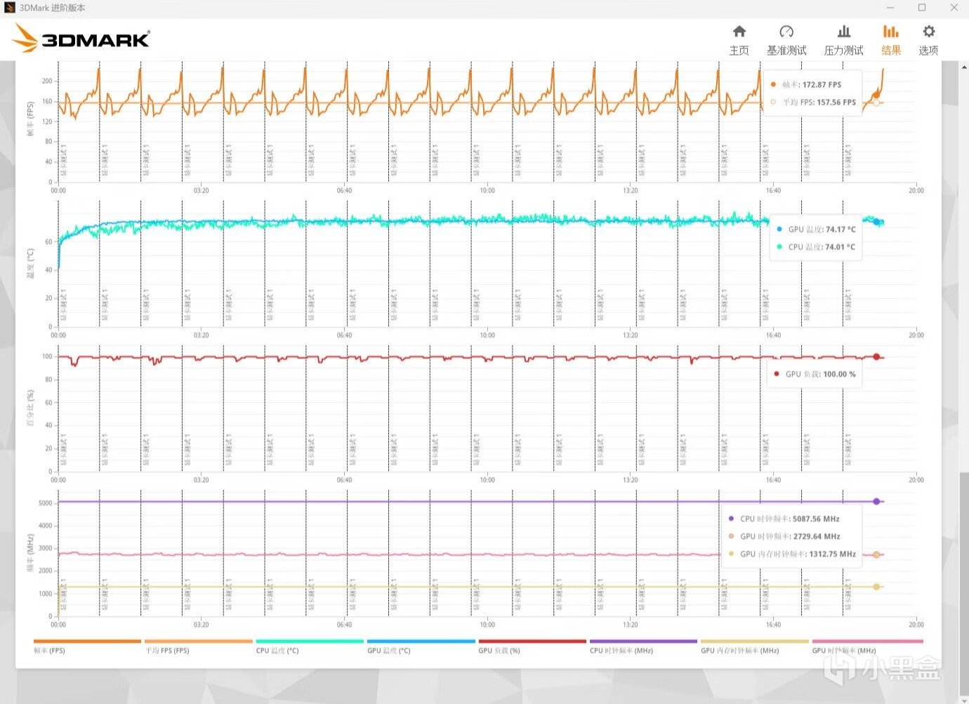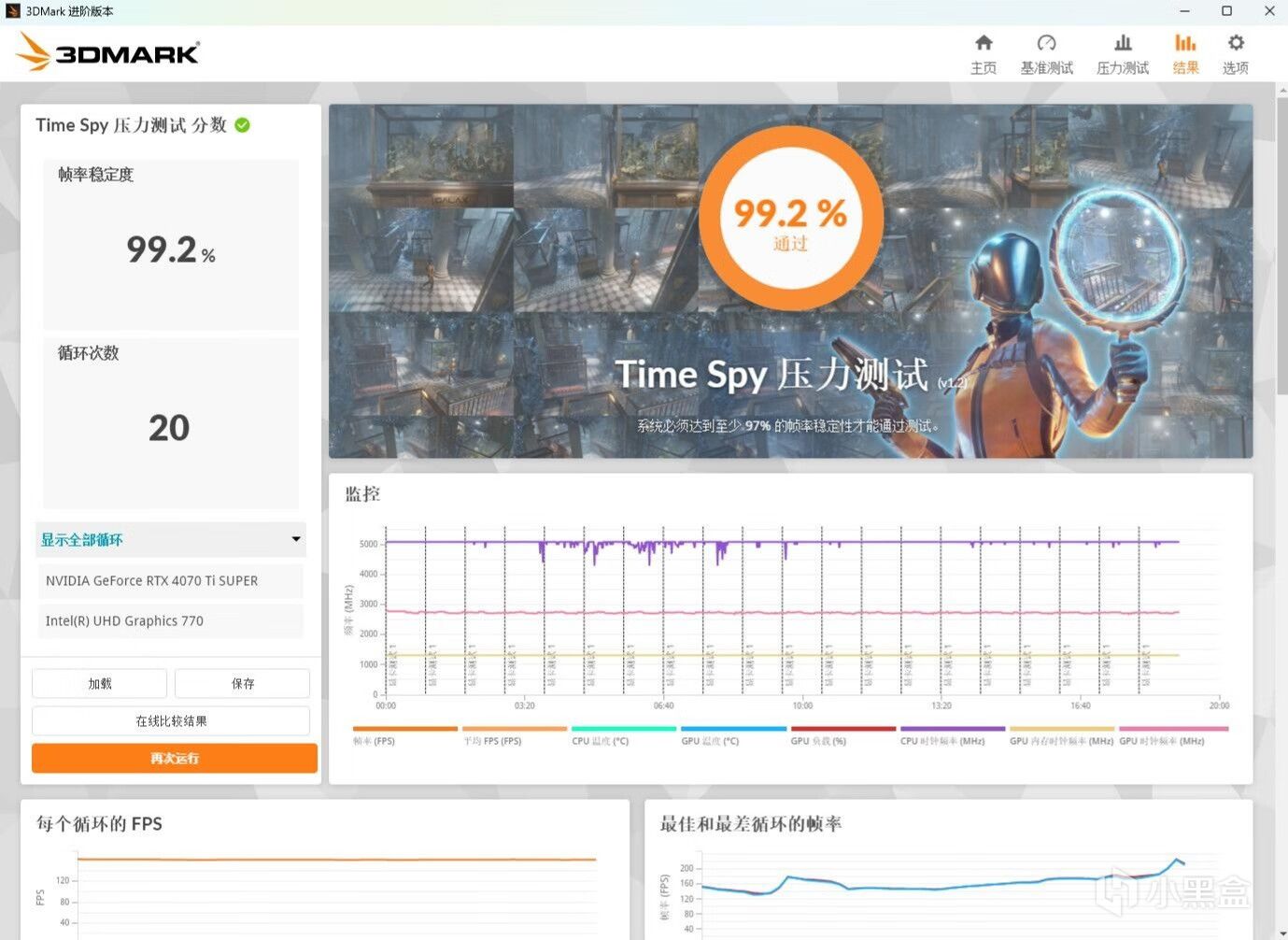 ▼跑个3Dmark的压力测试,帧数稳定率在99.2%,非常稳定。