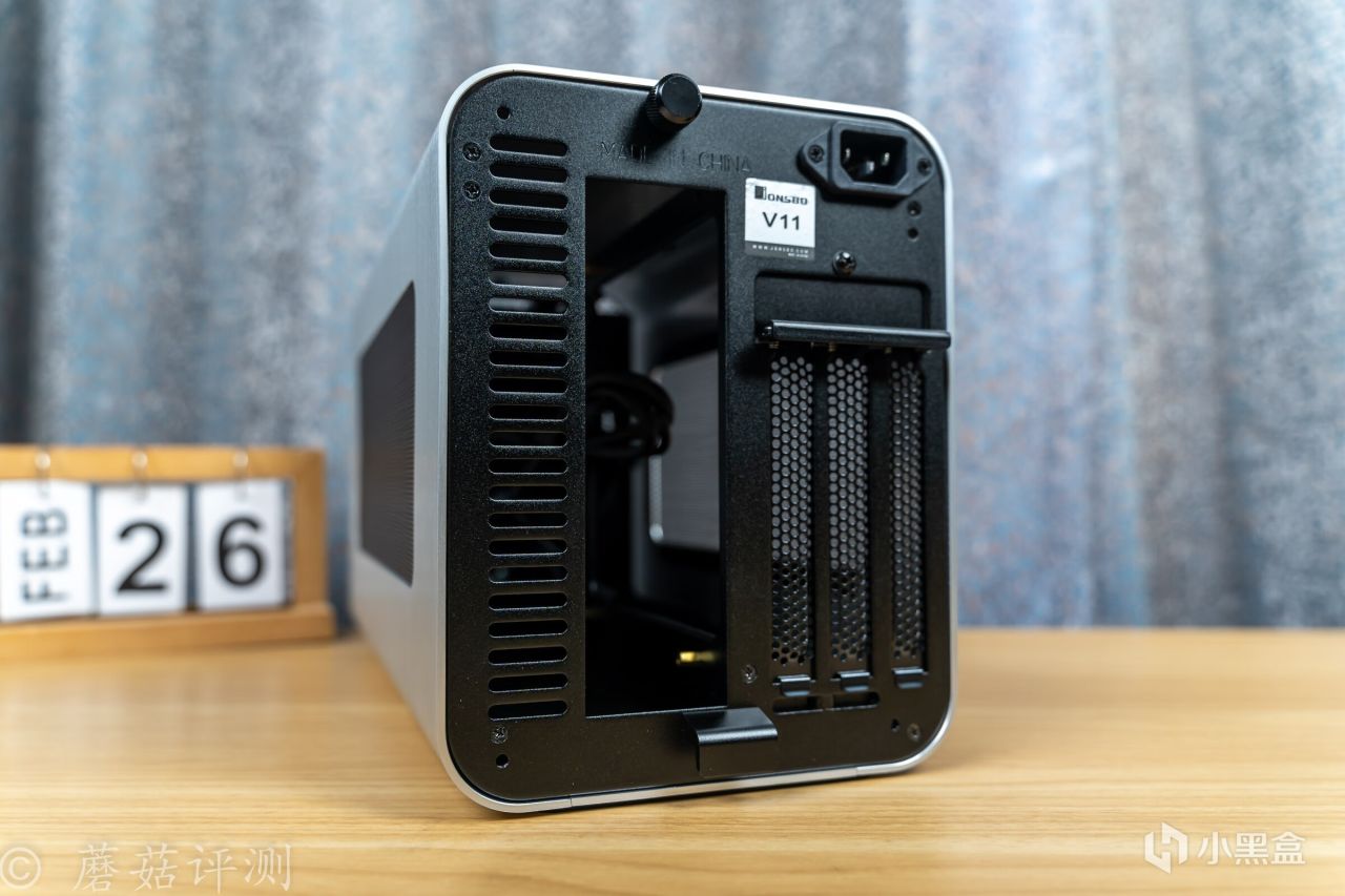 ▼机箱尾部,左侧是散热格栅,中间是主板的IO开口,右侧是竖置的显卡PCIe挡板,右上角是电源的插口。