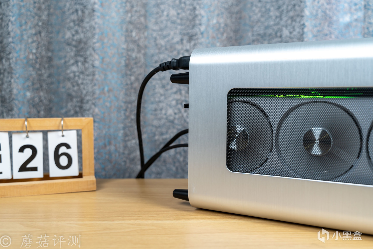 ▼机箱整体是长条形的,侧面的中间有金属冲孔网设计。