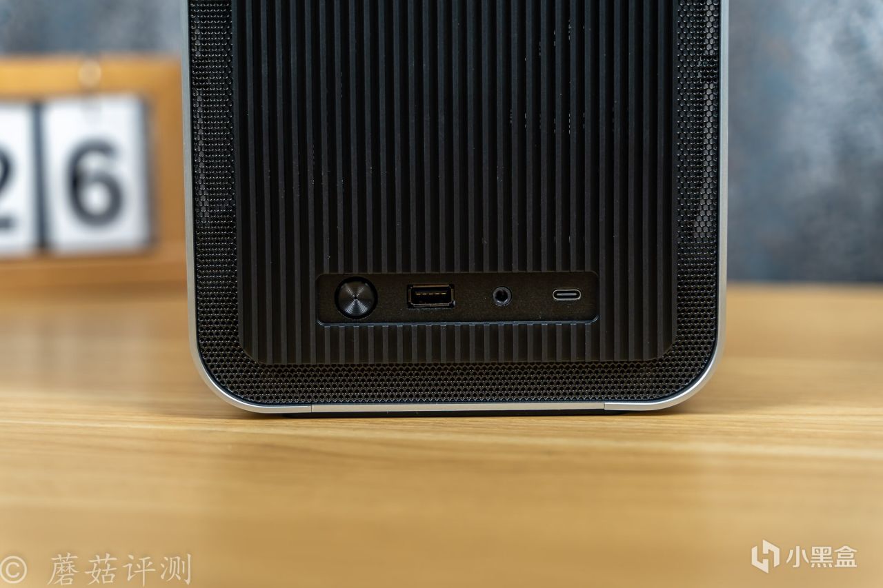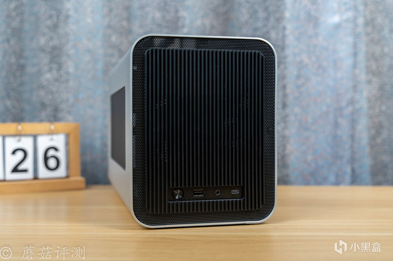 ▼底部是机箱的IO面板,从左到右依次是开机键、USB 3.0 Type-A接口、音频接口和Type-C接口。