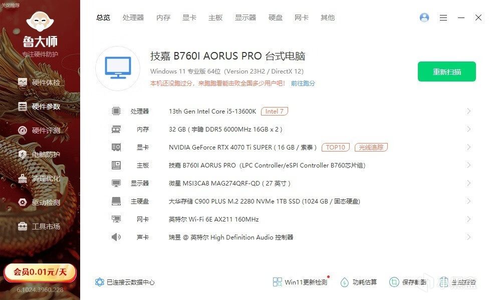 ▼整机配置一览,处理器是13600K,主板是技嘉的B760I,显卡是索泰的RTX4070 Ti Super月白,内存是宇瞻ZADAK的SPARK 16GB*2 6000MHz。
