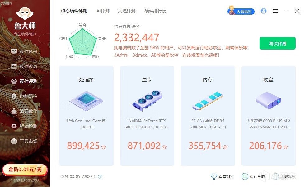 ▼简单跑个整机测试,整机得分233W,其中处理器单独得分89.9W,显卡单独得分87.1W。