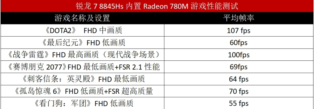 從測試來看,Radeon 780M的性能足以滿足FHD分辨率下流暢運行3A遊戲大作的需求,即便是《賽博朋克2077》《刺客信條:英靈殿》《孤島驚魂6》等要求苛刻的遊戲大作,平均幀率也能達到60fps以上,最近大火的《最後紀元》也能達到60fps,至於《DOTA2》《戰爭雷霆》這類電競網遊更是達到100fps以上。