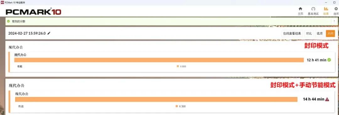 續航方面,玄智星2024青鋒配備了83Whr大電池,在封印模式下的PCMark測試中實現了12小時41分鐘的續航,此時性能得分也達到了6806分,和狂暴模式下的6951分相比差別不大,可見銳龍7 8845HS的能效比確實相當出衆。而在更極致的節能模式下,續航時間更是接近15小時,切實做到了充滿電覆蓋全天工作時間,移動辦公更加實用。