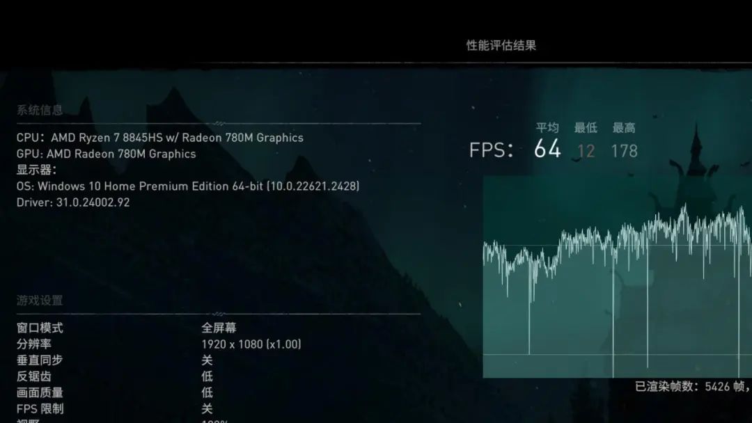 ▲FHD最低畫質,Radeon 780M可以讓《刺客信條:英靈殿》運行到64fps的平均幀率