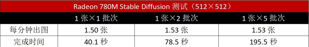 我們使用秋葉出品的Stable Diffusion整合包對銳龍7 8845HS的出圖性能進行測試,使用整合包默認模型,所有參數都使用默認設置。從測試結果來看,Radeon 780M即便是在512×512分辨率下連續出圖也沒有爆顯存,同時出圖效率極高。這就意味着,如果用戶要使用玄智星2024青鋒來完成一些輕量級的AI出圖工作,那也是完全可以滿足需求的,效率遠高於純處理器計算。