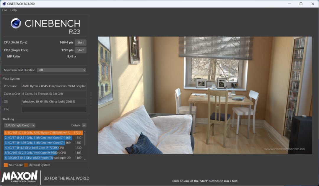 可以看到,在基於處理器計算的3D渲染測試中,銳龍7 8845HS在55W滿血輸出的狀態下表現十分優秀,達到了Zen4架構8核16線程處理器的優秀水平。由此可見用玄智星2024青鋒來完成一些專業3D設計任務是完全可行的,效率方面在筆記本中也是尤爲突出的。