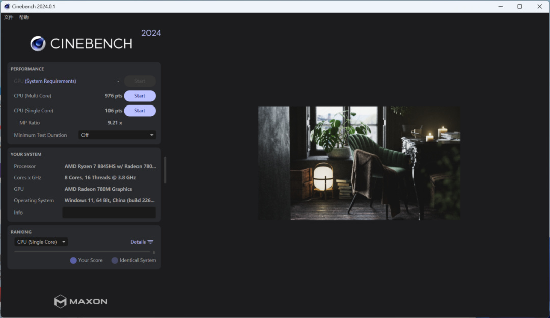 ▲Cinebench R24的多核分爲976,單核分爲106