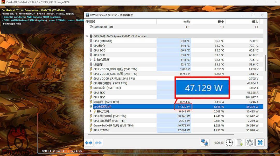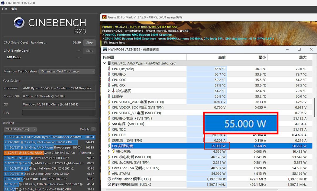 ▲Cinebench R23 + FurMark雙考,輸出功率也可達到官方標稱的55W上限