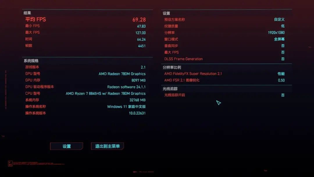 ▲FHD最低畫質+FSR 2.1性能,Radeon 780M可以讓《賽博朋克2077》達到接近70fps的平均幀率