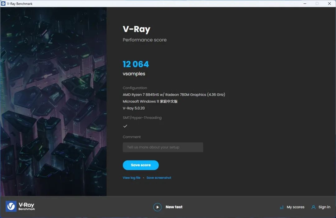 ▲V-Ray純處理器渲染,8核16線程銳龍7 8845HS得分達到12064