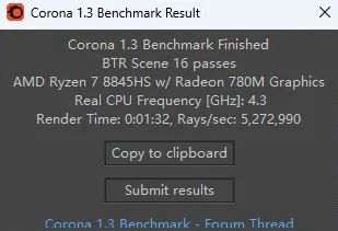 ▲Corona處理器渲染測試,銳龍7 8845HS完成時間爲1分32秒