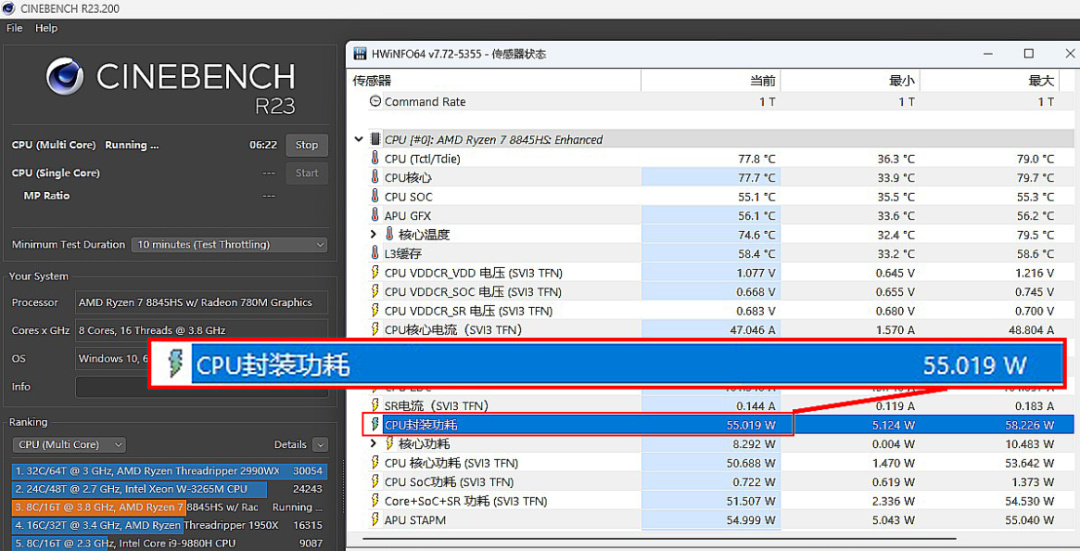 ▲Cinebench R23單考處理器,輸出功率可達官方標稱的55W上限